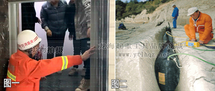 圖一、開(kāi)啟電梯門(mén):救援起重氣墊本體高度僅22mm-25mm,把起重氣墊放入電梯門(mén)窄縫中,充氣可1分鐘內(nèi)膨脹,解決了電梯狹窄縫隙作業(yè)難題,節(jié)省救援時(shí)間。