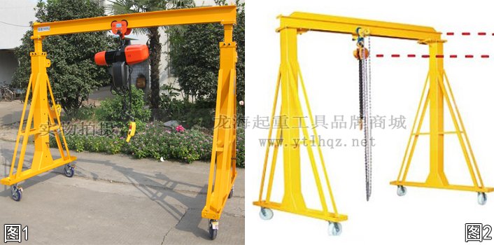 圖2、移動式龍門吊架:載荷500kg~2000kg,立柱頂部有斜撐結(jié)構(gòu),門架高度不能調(diào)節(jié);