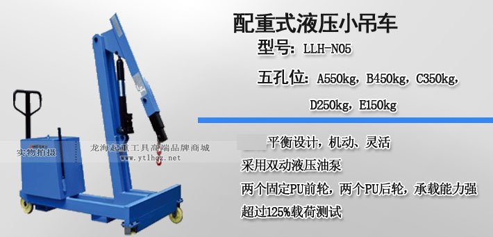 配重式液壓小吊車產(chǎn)品特點 ●配重式液壓小吊車,屬于可移動小吊車,平衡設(shè)計,機動、靈活。 ●移動式液壓小吊車,采用雙動液壓油泵; ●配重式液壓小吊車,操作者可輕易地避開障礙物,吊起物品; ●移動式液壓小吊車,兩個固定PU前輪,兩個PU后輪,承載能力強,耐磨壽命長; ●配重式液壓小吊車,通過125%載荷測試; ●根據(jù)需要,5個孔位可調(diào),載荷分別為550kg、450kg、350kg、250kg、150kg。